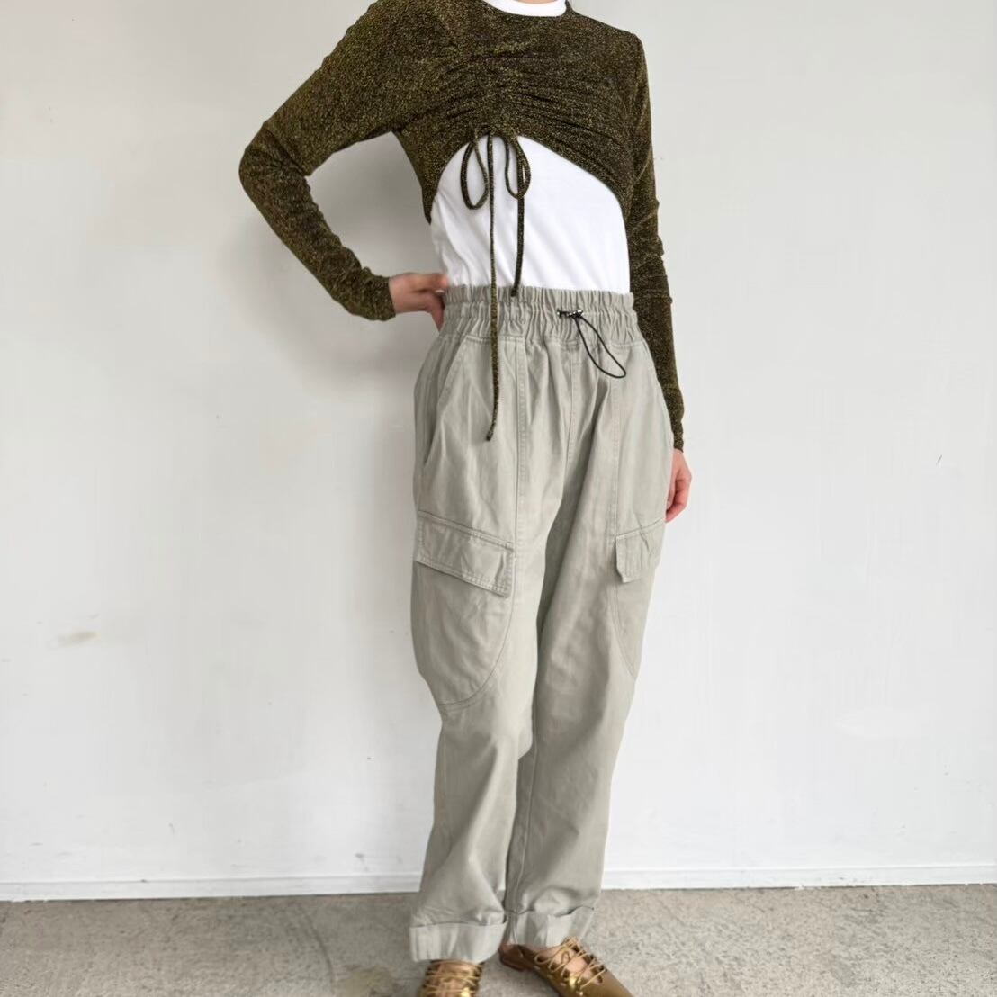 センタープレスが入ったベージュのワークパンツ。 ウエスト部分はゴム仕様で、リラックスした履き心地です。