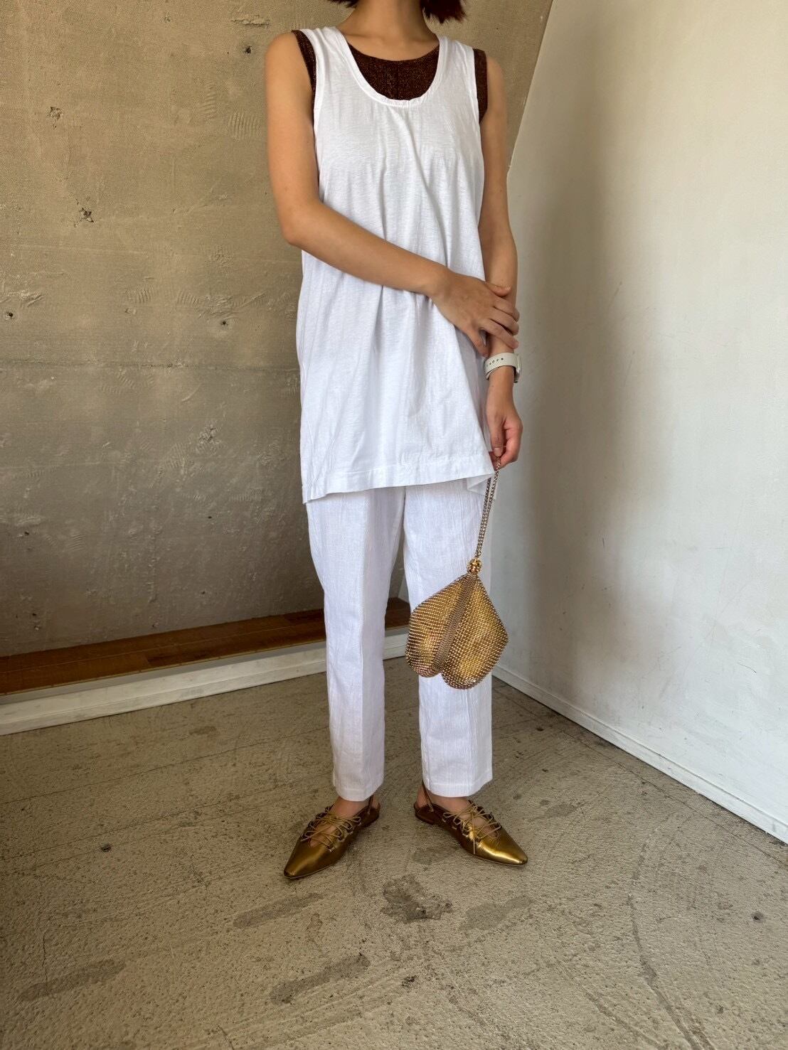 白のノースリーブトップス。