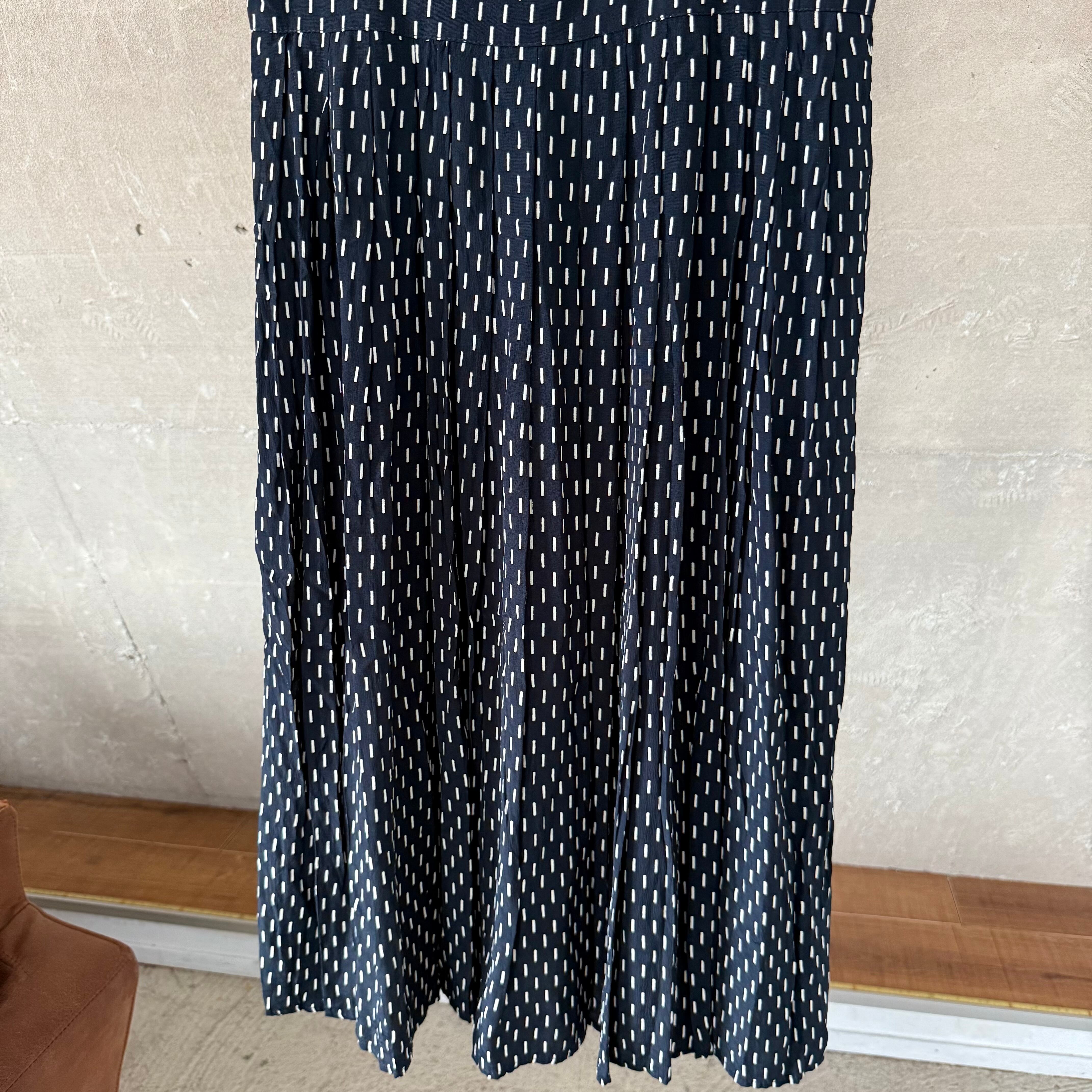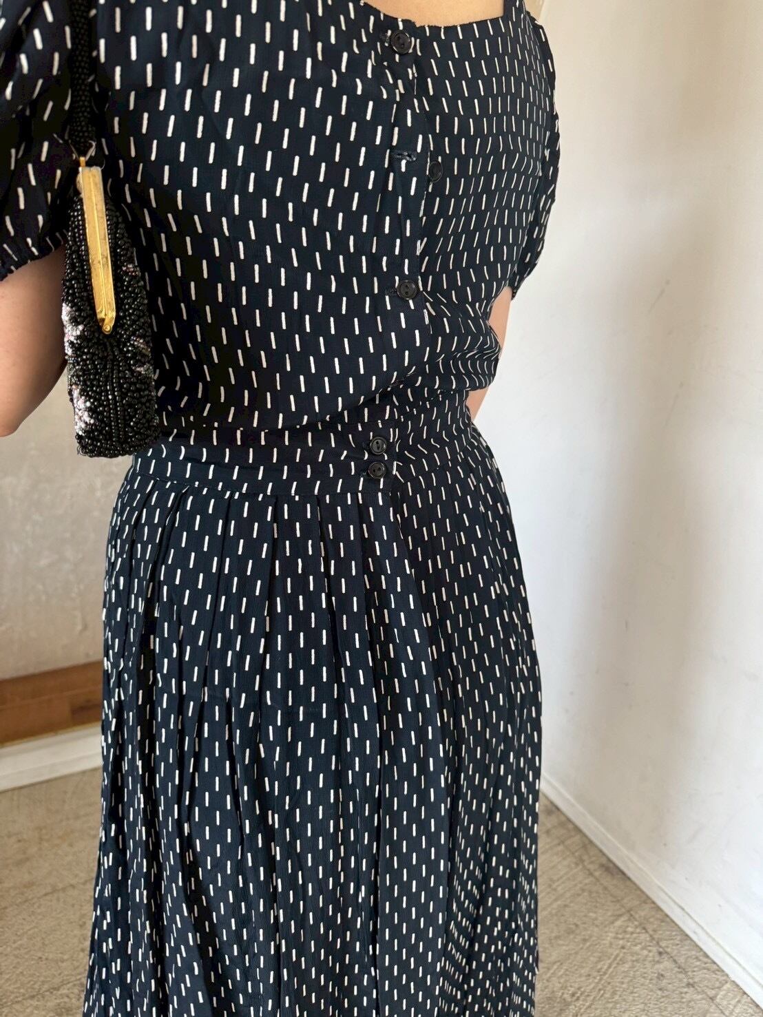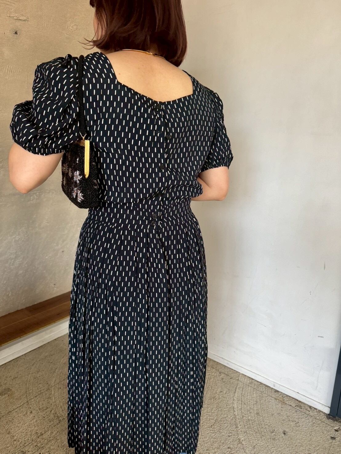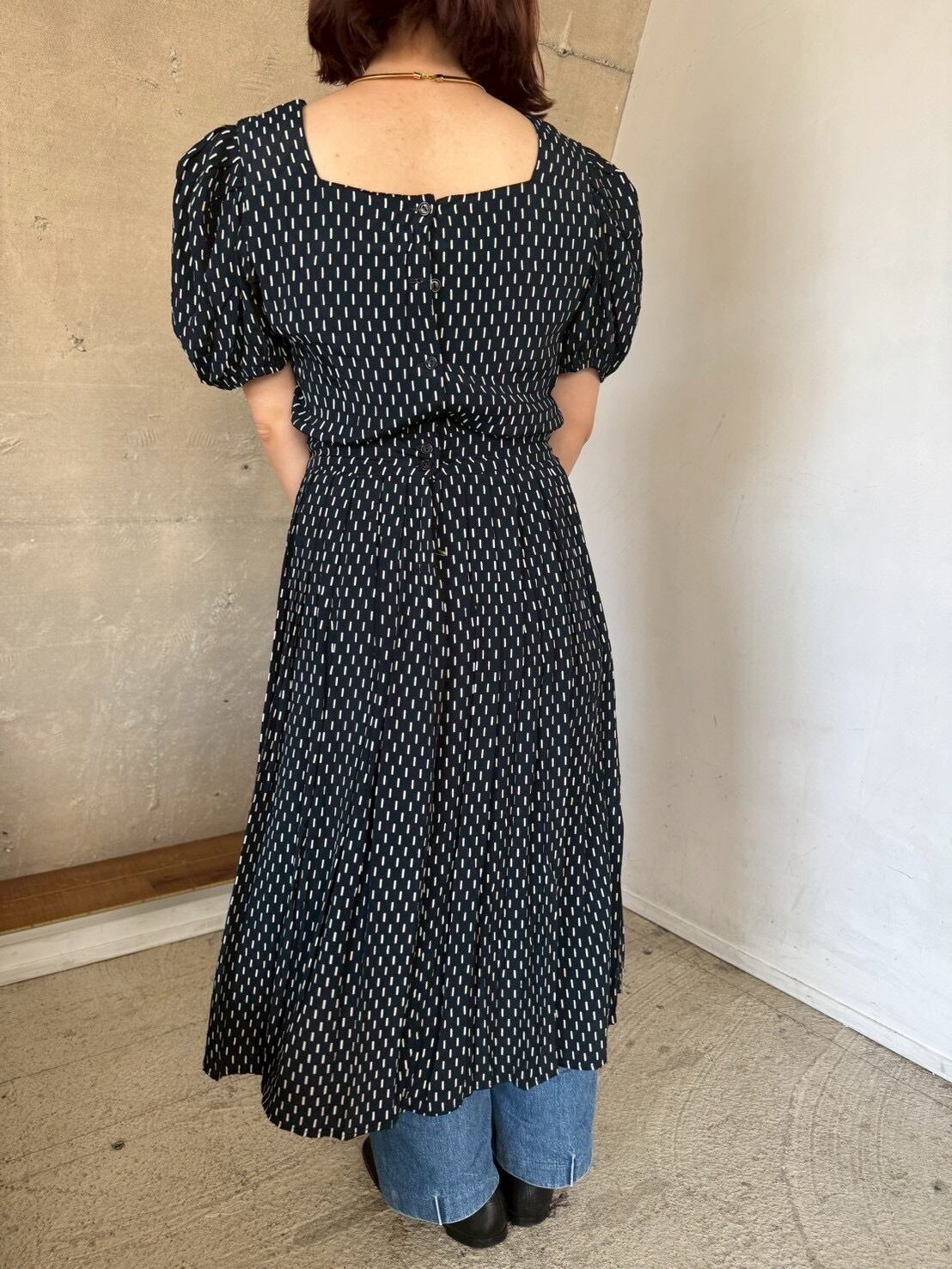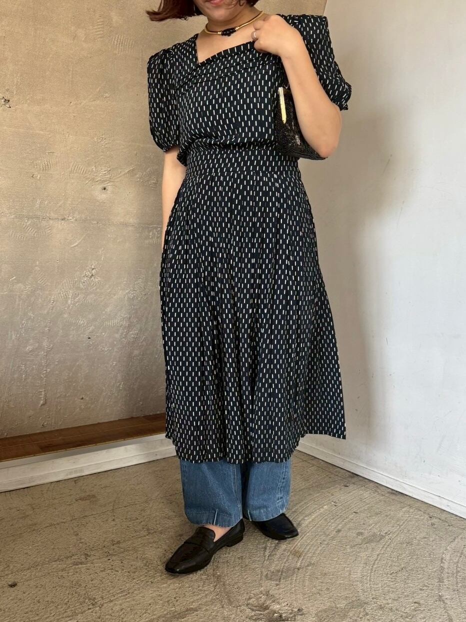 ネイビー地に細かなホワイト模様が並ぶ、可愛らしいワンピース。