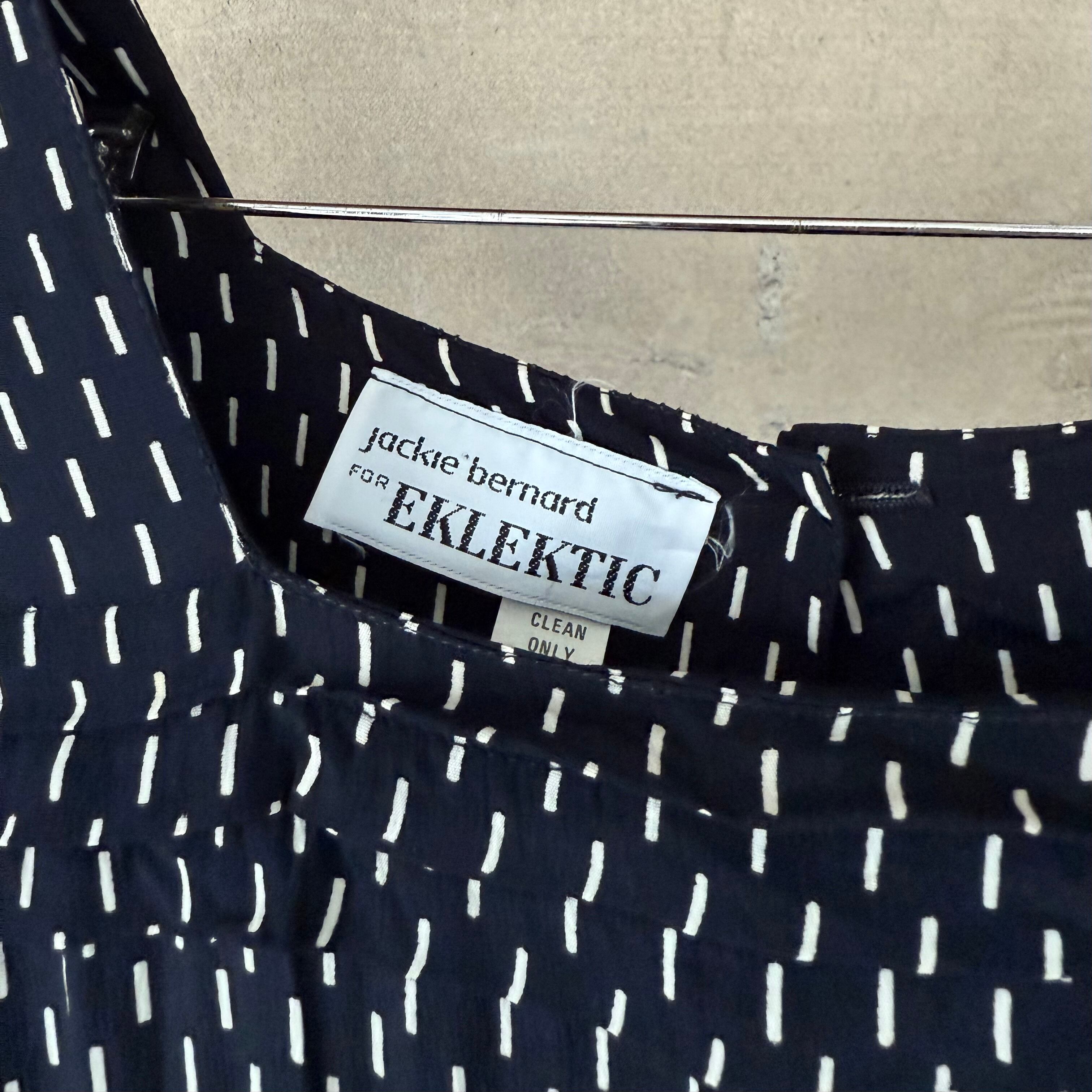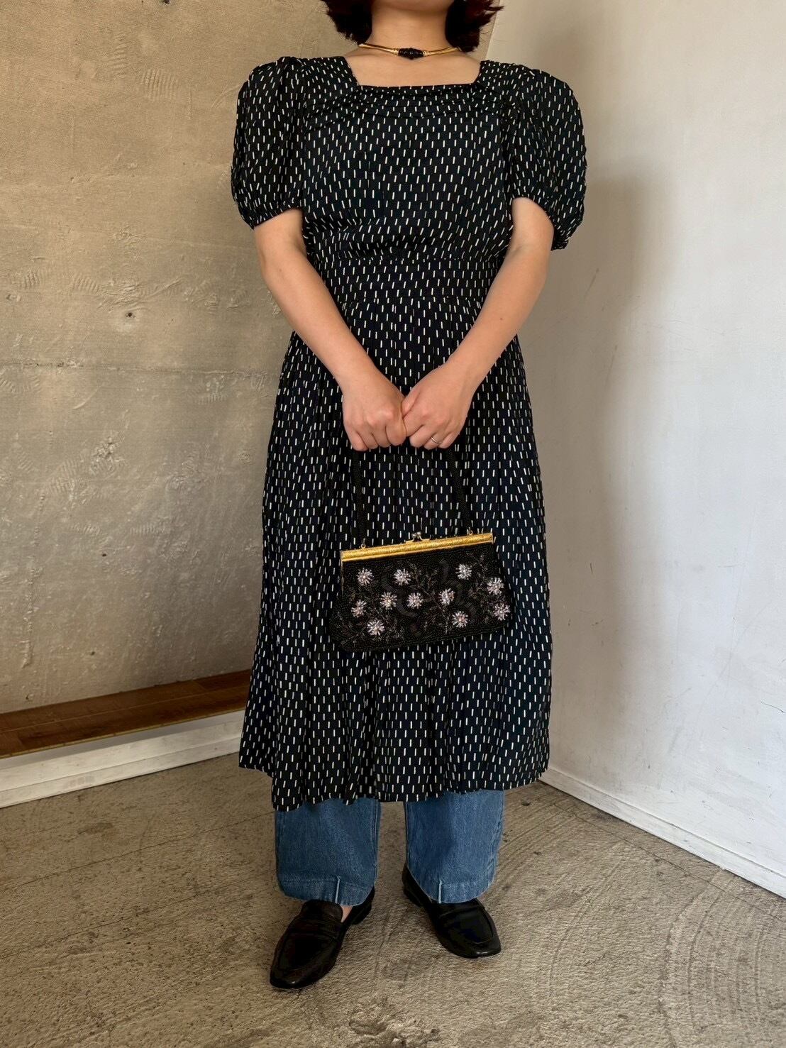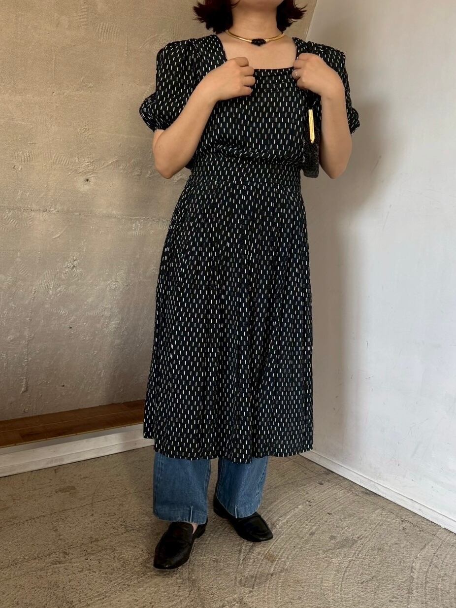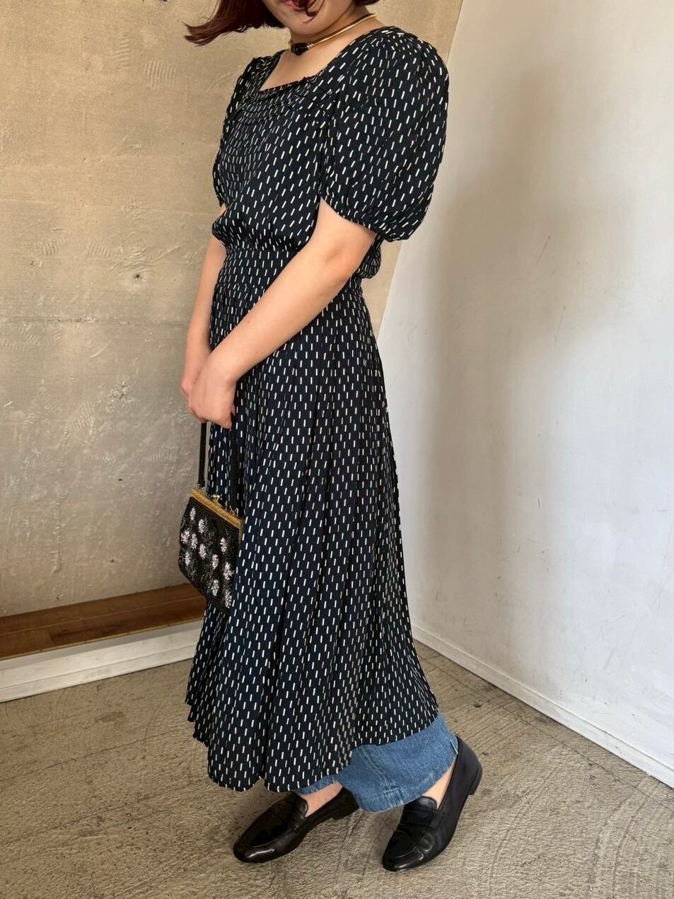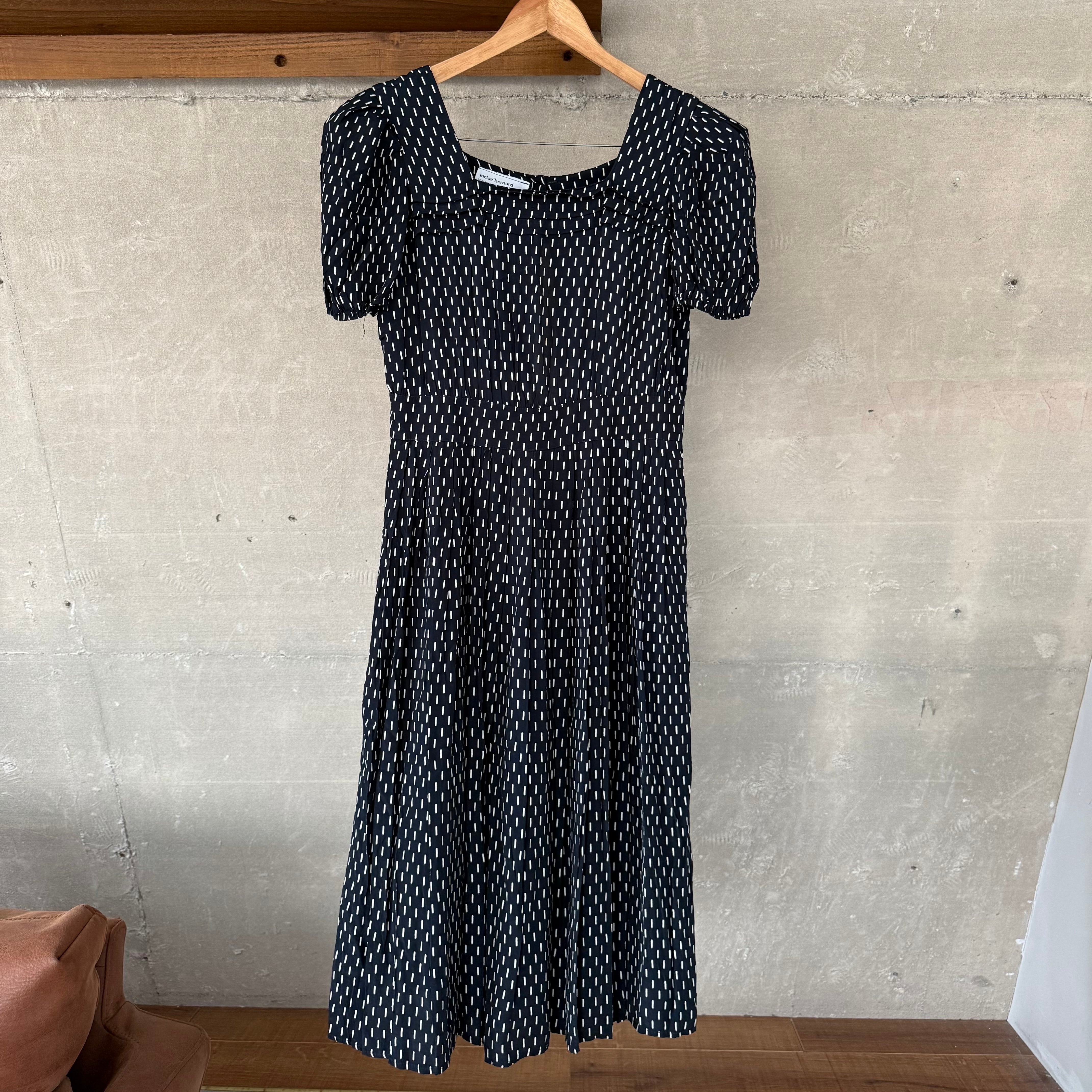 ネイビー地に細かなホワイト模様が並ぶ、可愛らしいワンピース。