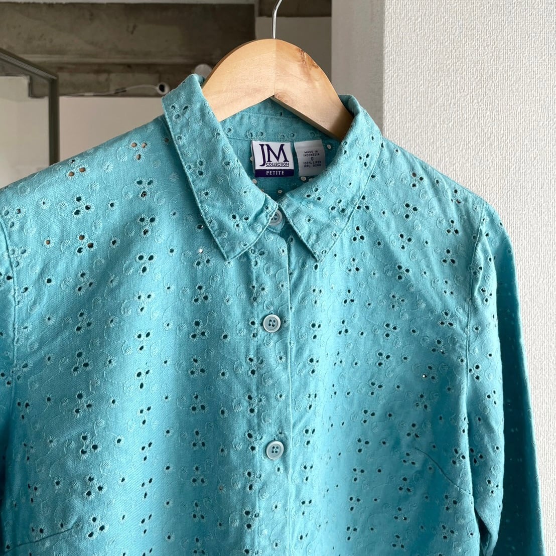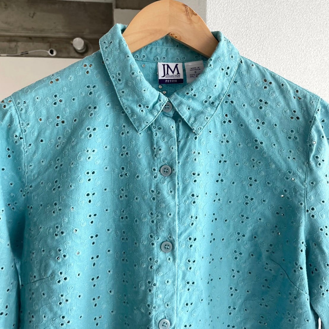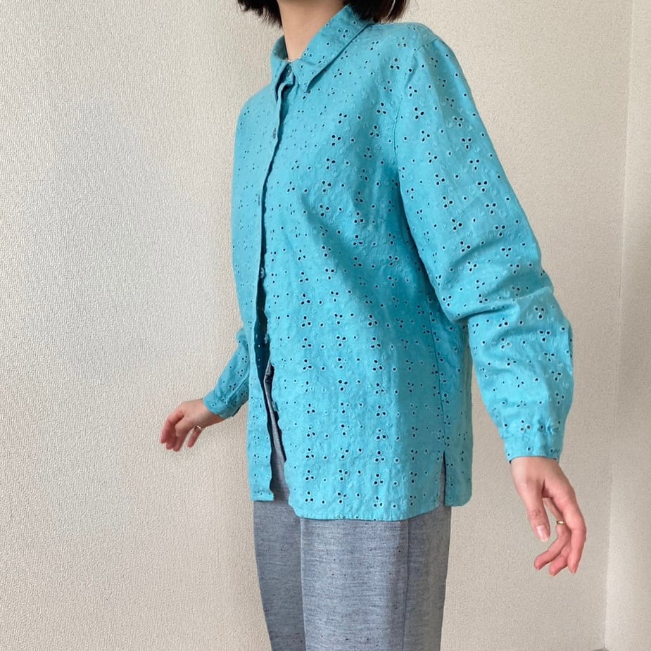 made in indonesiaの淡いブルーがポイントのレースブラウス。